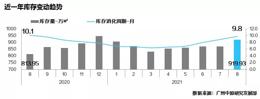 库存状况:库存周期再升近1个月,年内已持续5个月回升截至8月末,全市库存量919.9万㎡,去化周期9.8个月。由于成交量减少且供应量增多,导致全市整体库存量增多,本月整体去化周期再升近1个月;库存周期在经历一年走低之后,于今年3月起持续回升,且持续5个月回升。
