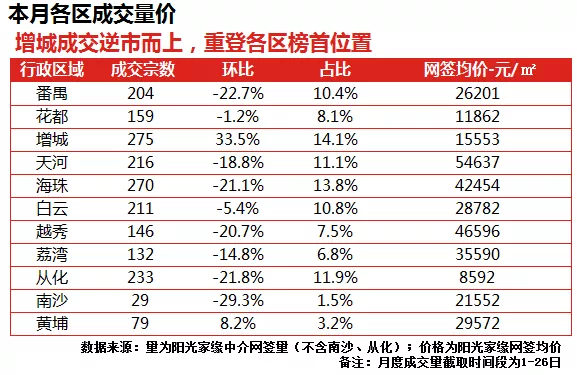 增城成交逆市而上,重登各区榜首位置从各区成交情况来看,本月增城、黄埔成交表现相对亮眼,本月两区分别成交275宗、79宗,环比上涨33.5%、8.2%。其中,增城区成交占比更是上涨至14.1%,位列各区榜首位置。另外,其余各区成交均有不同程度的下滑,其中南沙、番禺、海珠、越秀、从化等区域下滑相对明显,本月分别成交29宗、204宗、270宗、146宗、233宗,环比分别下降29.3%、22.7%、21.1%、20.7%、21.8%。