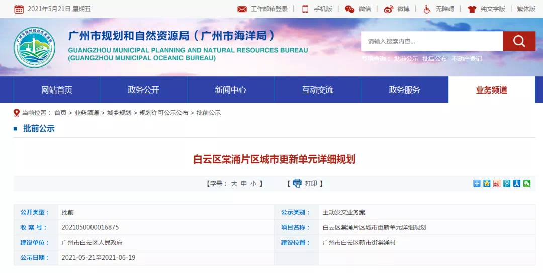 5月21日,广州市规划和自然资源局发布《白云区棠涌片区城市更新单元详细规划》批前公示,为促进满足棠涌片区的更新改造需求,本次城市更新单元详细规划拟重点对该片区用地、道路、公服进行优化。