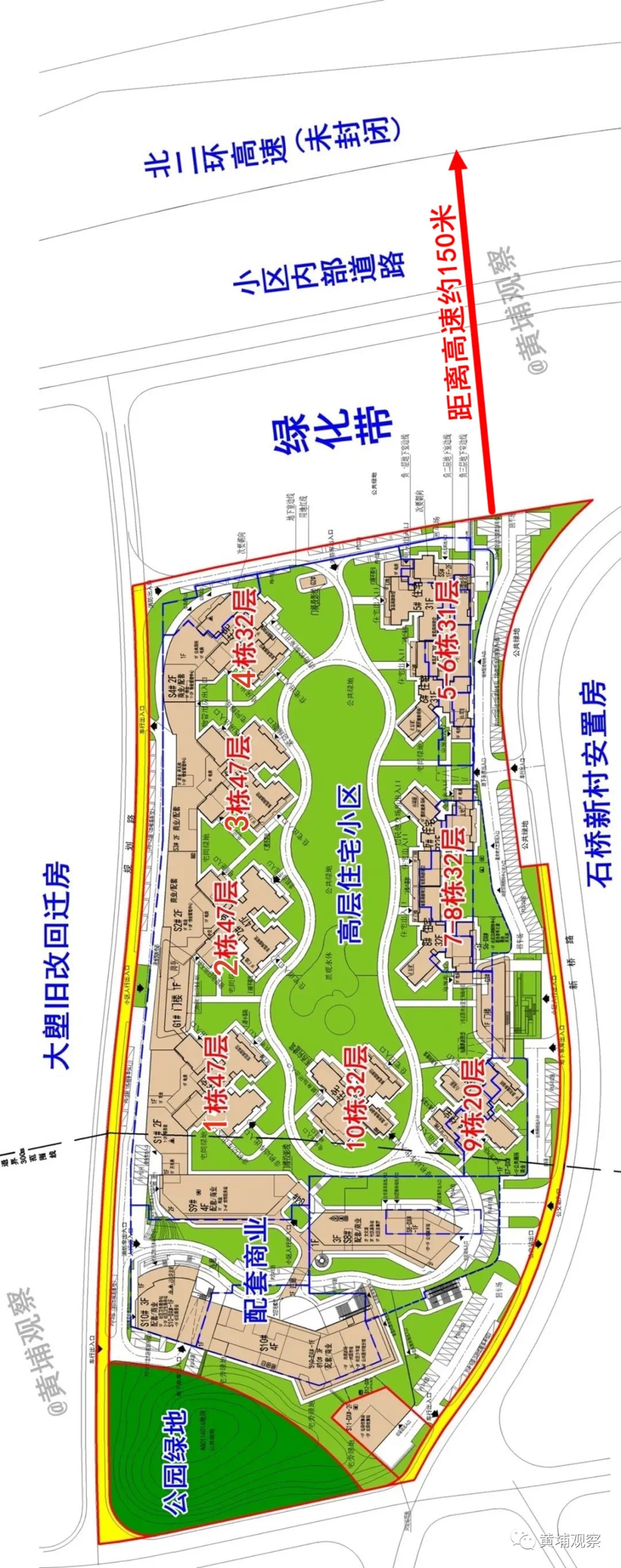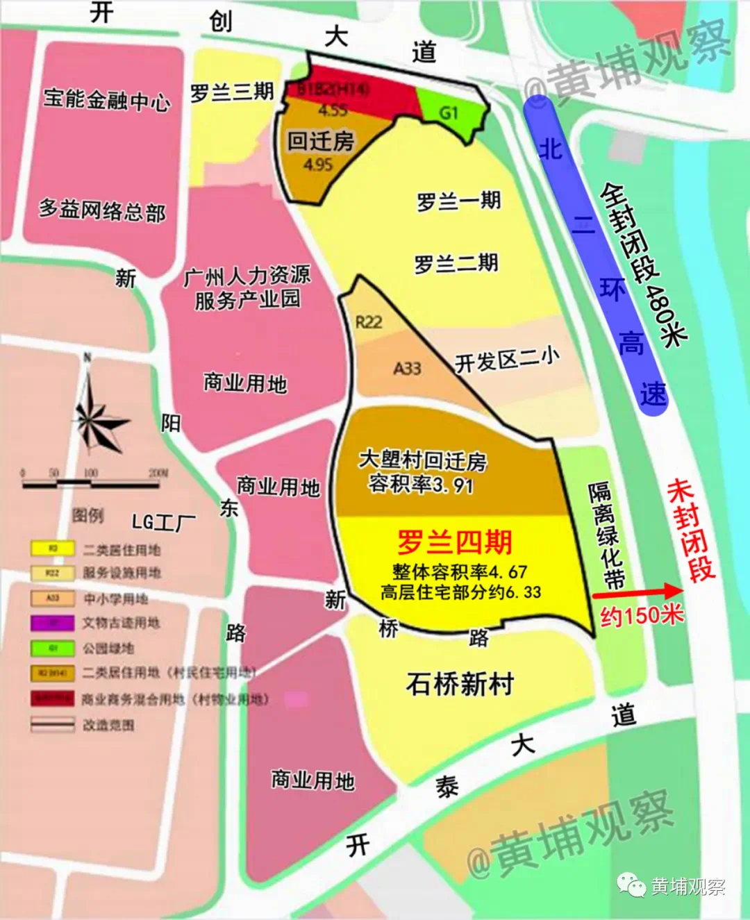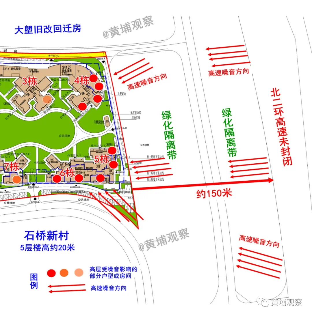 尽管距离高速150米并设置绿化隔离带,但罗兰四期以及大塱旧改安置区部分楼栋,大概率将在高速噪音的轰炸范围。基本常识是,在无建筑物遮挡情况下,高速噪音直线传播距离可达四五百米。何况150米,高层住宅完全暴露在声波的立体传播下,噪音可想而知。虽然罗兰四期与北二环之间,规划设置为两处绿化隔离带,即便种植二三十米高的高大乔木,也仅仅对于10楼以下的楼层有降噪隔音效果。而对于中高楼层,几乎没啥作用。