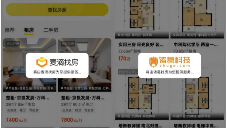 从“美团找房”的页面内容看,目前主要业务涵盖租房和二手房两大板块。而在点击相关房源信息后,跳转到的是“麦滴找房”和“诸葛找房”服务页面,美团在这个过程中扮演着提供流量分发服务的角色。