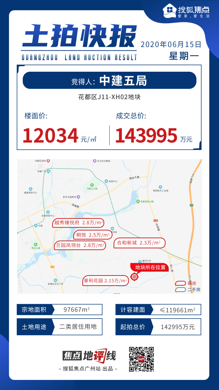 6月15日,中建五局以143995万元的总价,竞得花都镜湖大道J11-XH02地块,折合楼面价约12034元/㎡。