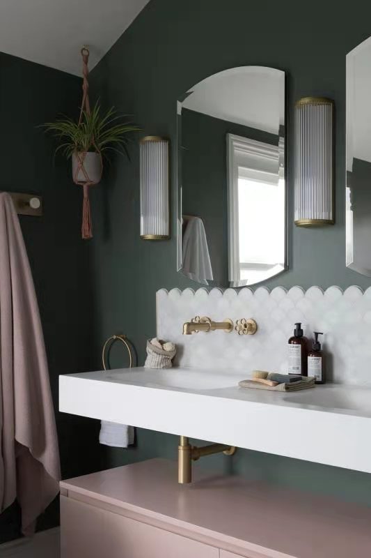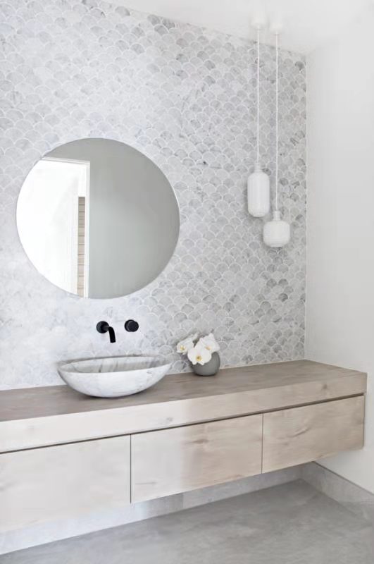 如果害怕“密集恐惧症”,或者想要卫生间视觉空间变大,那么部分拼贴鱼鳞砖也是极为潮流的选择。