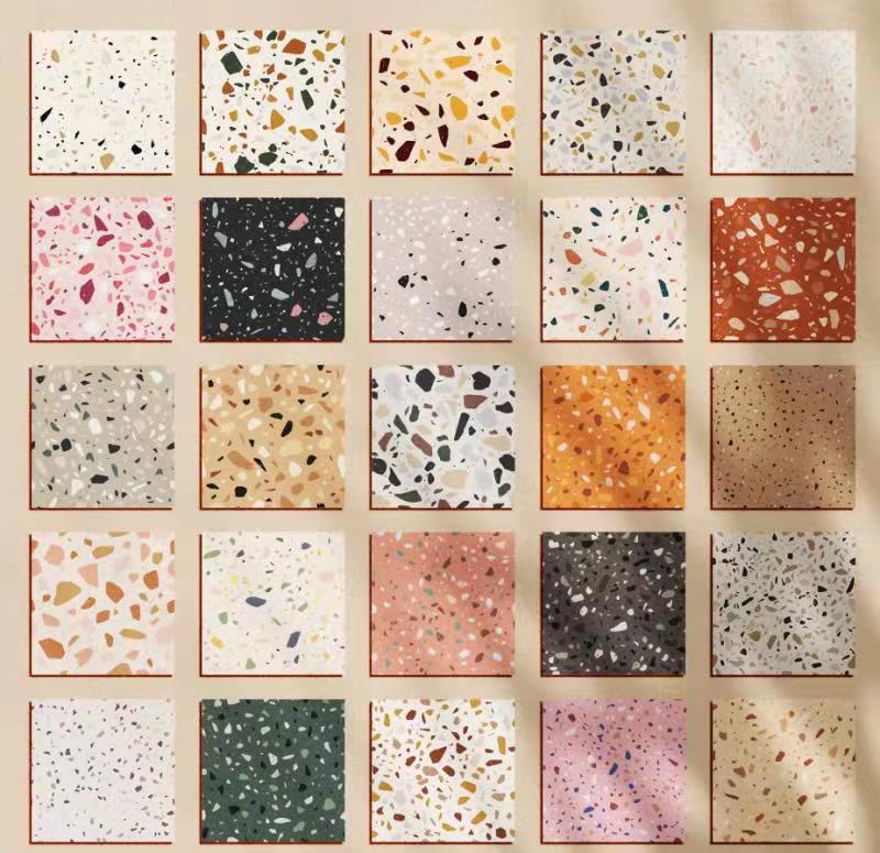 水磨石是混入了碎石、玻璃、石英石等骨料后的混凝制品,因为表面又经过了研磨和抛光,所以在保留了不规则的碎片痕迹同时色泽光洁艳丽,样式更是繁杂多样。