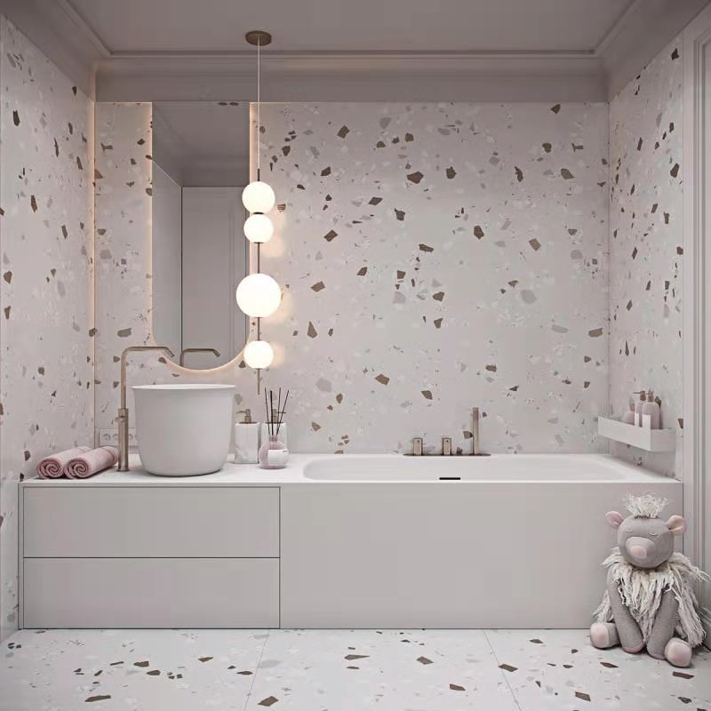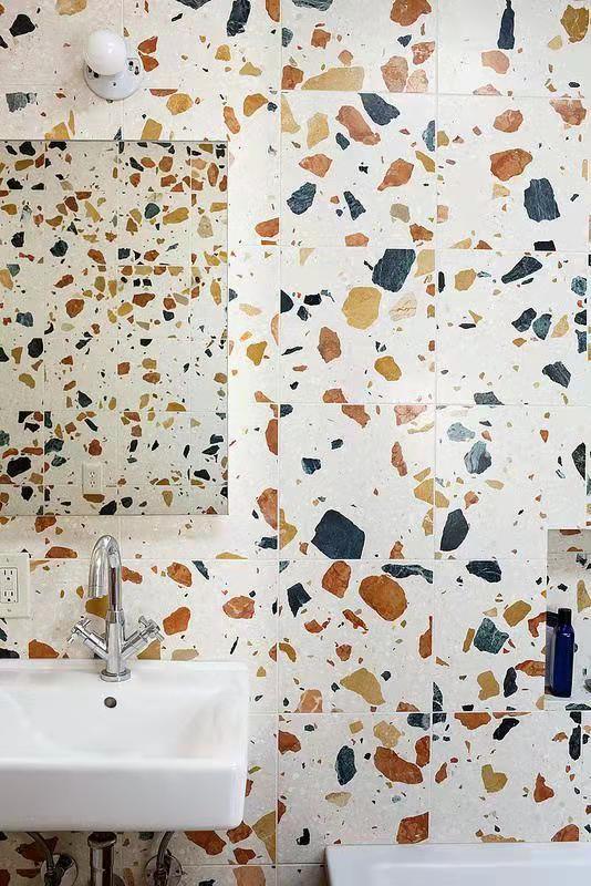 水磨石和常规瓷砖的拼接是更为出挑不出错的搭配。而全面积的使用水磨石建议选择碎片花纹较大的样式,也是别具风格。