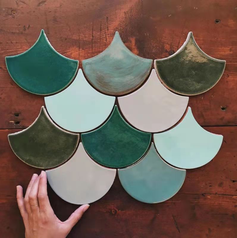 鱼鳞砖,顾名思义就是下面这种形状和鱼的鳞片一样的扇形瓷砖。全面铺开的话,既像鱼鳞又像是波浪,层次感满分。