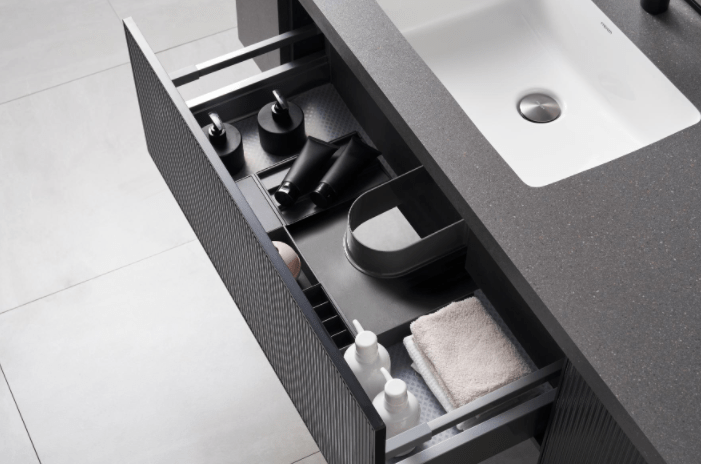 在井然有序的空间中,打造收放自如的生活体验。封闭式双抽设计,有效隔绝水汽,海蒂诗抽屉滑轨,开合静音,内装抽屉分区收纳盒,满足不同物品有序藏纳。