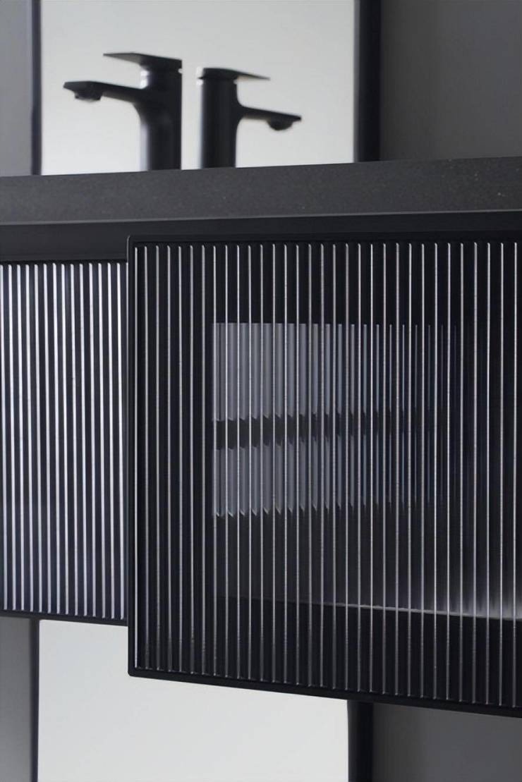 FAENZA法恩莎朗诺系列定制浴室柜以高品质材质融入精工工艺,创造舒适的空间体验,曜岩黑岩板台面,搭配暗夜银丝多层实木生态板柜身,主柜抽面5mm艺术玻璃贴,搭配哑光黑金属边框,材料与色彩的碰撞衔接,带来丰富的空间层次感。