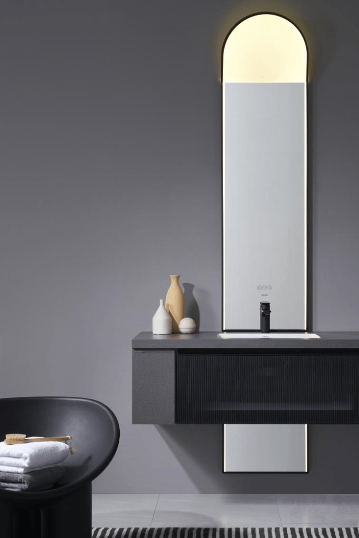 FAENZA法恩莎朗诺系列定制浴室柜采用高阔LED智能镜,以科技点亮生活的高光时刻,智能灯控,环绕式光源,自带亮度记忆功能,三键触控·防雾+双色灯带,暖光营造舒适氛围,冷光定格精致妆容,导光板+扩散板发光,满足空间装饰的同时,更具照明补光效果。