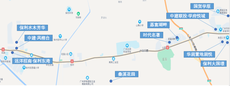 朱村站有叠溪花园,而山田站则有时代名著、荔富湖畔和广铝四方天地以及稍远处的国贸学原、中建联投·学府悦城、保利大国璟等项目。