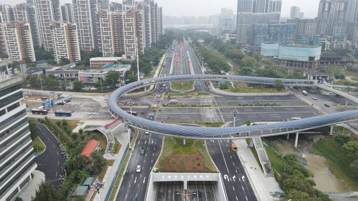 诸如此类的难题比比皆是。开放大道建设之难,一是要穿过集中连片的建成区,施工难题复杂多变,二是按照准快速路标准规划,极少设置红绿灯,所以要“穿山入地上天”,建设“五桥、四隧、一电、十一座人行天桥”。项目总投资为34亿元(整个开放大道高达50亿元),是迄今为止黄埔区基建投资额及建设规模最大的市政道路工程项目。
