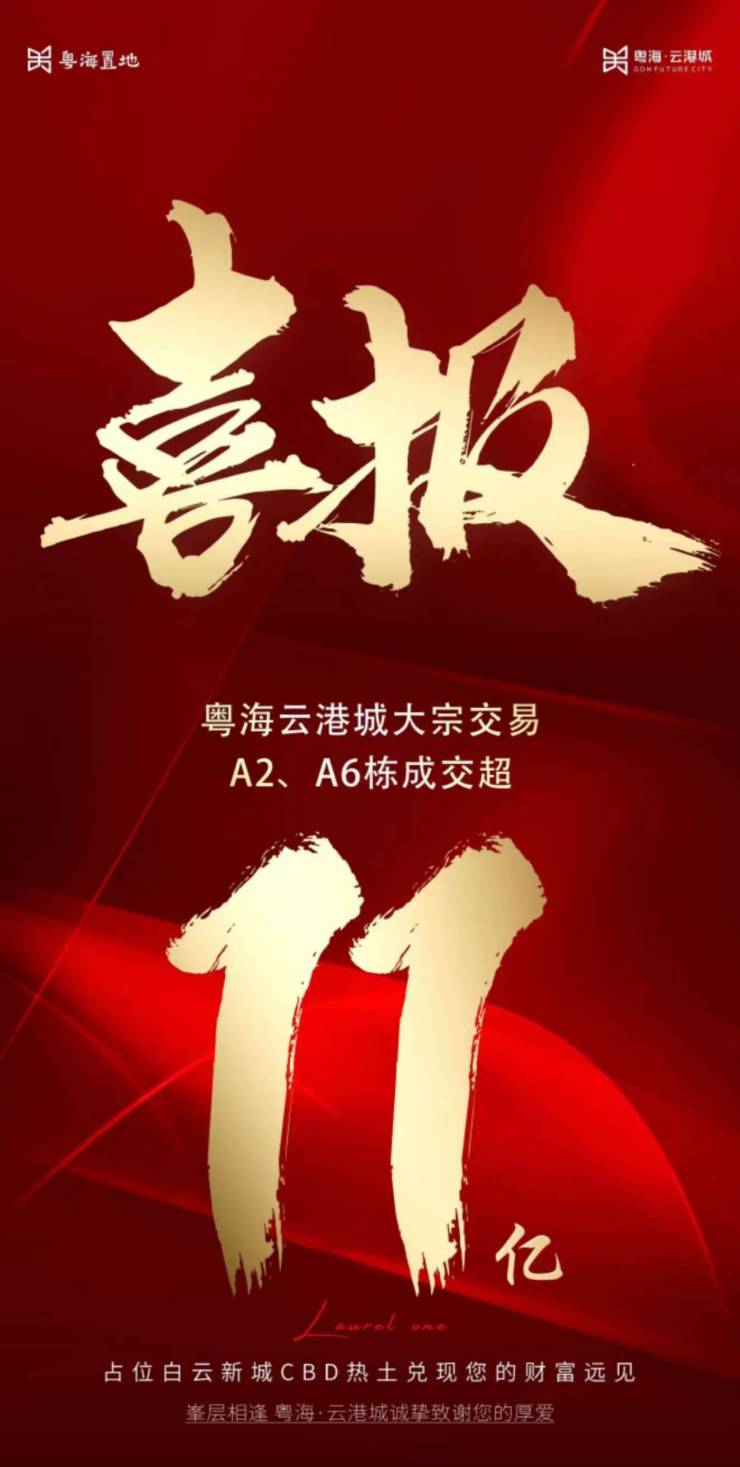 市场消息称,2023年12月17日,粤海云港城喜获A2及A6两栋共计220套商办物业资产的大宗交易,与深圳一运营公司正式签约,总成交额超11亿元。
