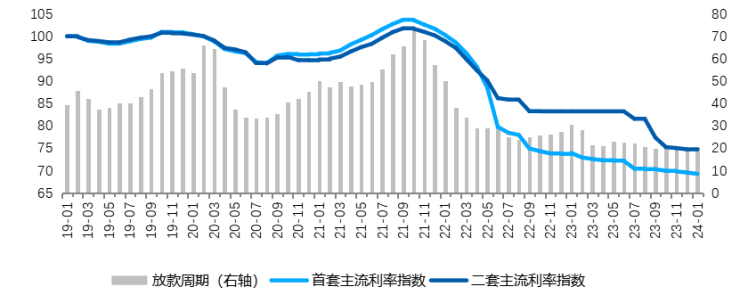 分能级统计,2024年1月一线城市首二套房贷利率分别为4.13%、4.54%,均与上月持平;二线城市首套利率降低2BP至3.86%,三四线城市首套利率降低2BP至3.82%;二线和三四线城市二套利率均维持上月水平。