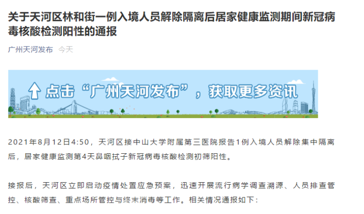 据“广州天河发布”微信公众号消息,2021年8月12日4:50,天河区接中山大学附属第三医院报告1例入境人员解除集中隔离后,居家健康监测第4天鼻咽拭子新冠病毒核酸检测初筛阳性。