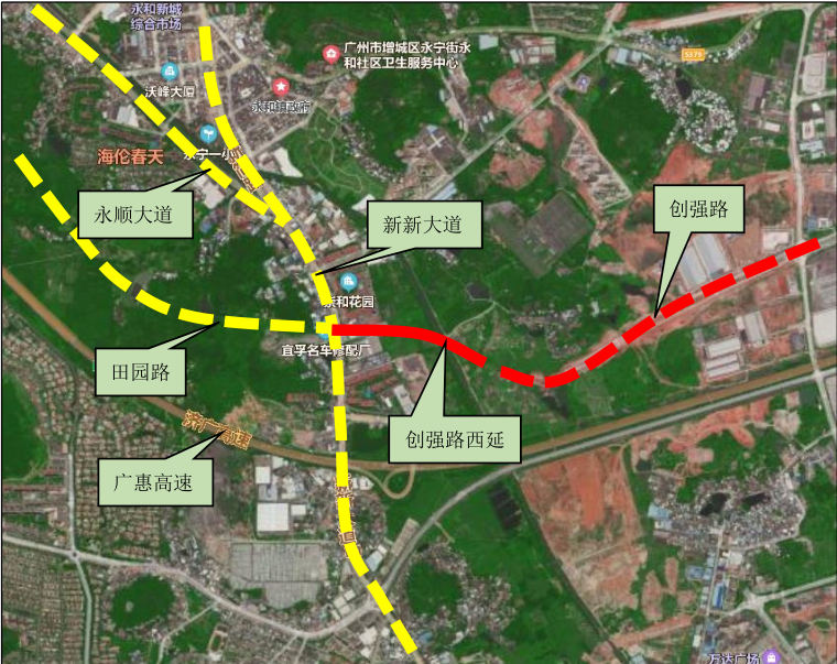 创强路西延线工程是连接西侧田园路与东侧创强路的重要纽带。创强路西延线的建设,打通了田园路-创强路这一东西向主干道,有利于缓解永顺大道、广惠高速的交通压力,起到分流作用。