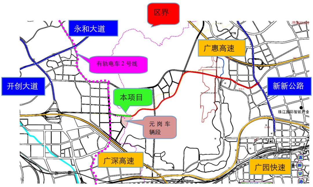 由于黄埔区有轨电车 2 号线的云埔一路站和元岗站位于本片区,设车辆段 1 座——元岗车辆段,位于宁埔大道(开发区段)南侧。因此有轨电车将在宁埔大道中央绿化带设置支线出入元岗车辆段。项目总投资16069万元,其中建安费用13611万元,其他费用1693万元,预备费用765万元。资金来源为区财政资金。施工工期18个月。目前,该项目正在进行工程施工总承包招标。