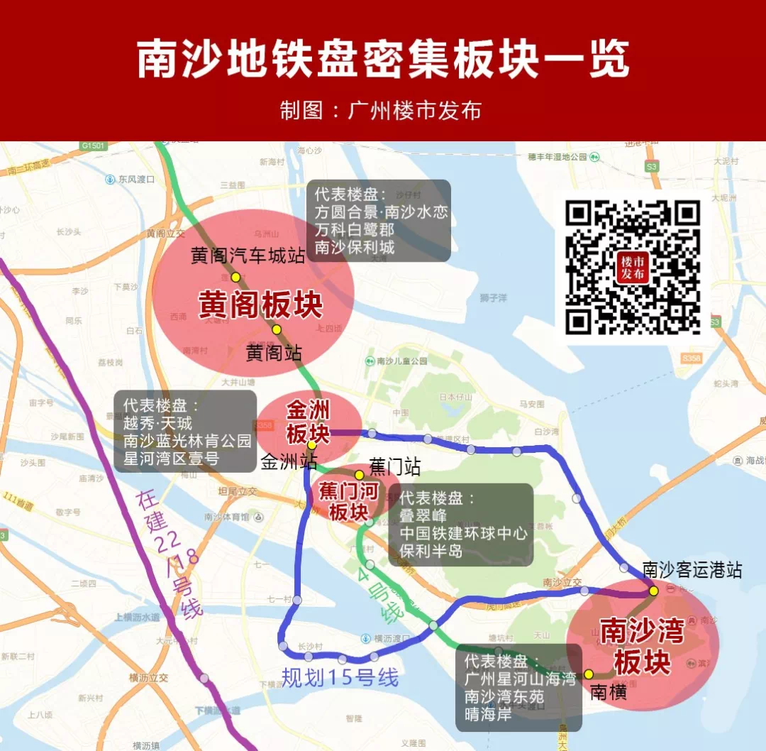 楼市君梳理发现,南沙地铁盘主要分布在金洲、蕉门河、南沙湾和黄阁4个板块。