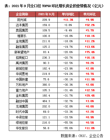 具体从企业表现来看,2021年9月百强房企中逾9成企业单月业绩同比降低,其中6成企业同比降幅大于30%。同时,包括绝大部分TOP30房企在内,也有近9成企业单月业绩不及上半年月均水平。整体来看,9月房企单月业绩表现不及上半年及历史同期,逾半数百强房企同环比双降。值得注意的是,在全口径TOP50中有21家房企9月单月业绩环比上升,其中阳光城9月单月销售业绩209.9亿元,是少有一家同环比双增的企业。