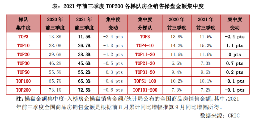 2021年前三季度,TOP100和TOP200房企销售操盘金额集中度分别为65.3%和72.5%,较去年同期分别降低0.4和0.6个百分点。具体来看,今年以来TOP3龙头房企规模增速放缓明显,截至9月末TOP3房企销售操盘金额集中度较去年同期显著降低2.4个百分点至11.5%。