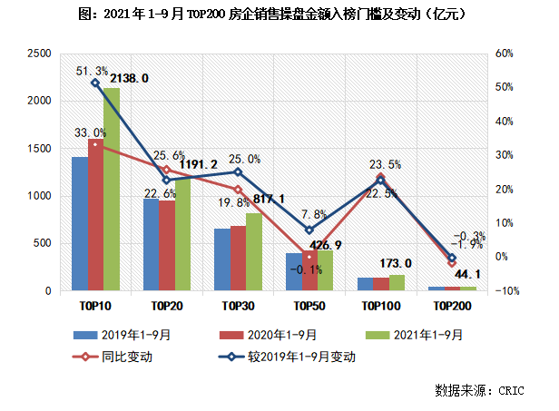 而TOP50房企销售操盘金额门槛仅保持在426.9亿元,门槛增幅低于其他梯队房企。此外,截至9月末TOP100房企的销售操盘金额门槛同比增长23.5%至173亿元,而TOP200房企门槛则同比降低1.8%至44.1亿元,销售规模格局进一步分化、行业竞争加剧。