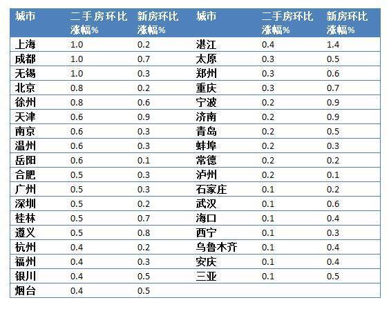 二手住宅销售价格上涨的城市分别为:上海、成都、无锡、北京、西安、徐州、天津、南京、温州、岳阳。其中,上海、无锡、成都三城环比涨幅并列第一,环比上涨1%;北京、徐州、西安次之,均环比上涨0.8%。