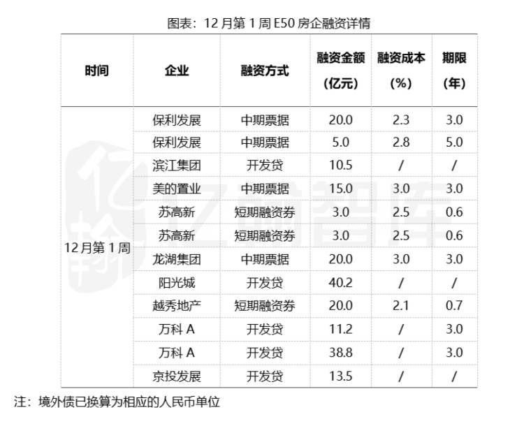 来自亿翰智库的数据显示,12月第1周,50家房企融资规模217.24亿元,主要是国央企发行债券以及部分企业发行开发贷。亿翰智库认为,随着龙湖集团储架式债券“22龙湖拓展MTN002”发行,未来部分优质民企的流动性危机将得到一定程度的缓解。