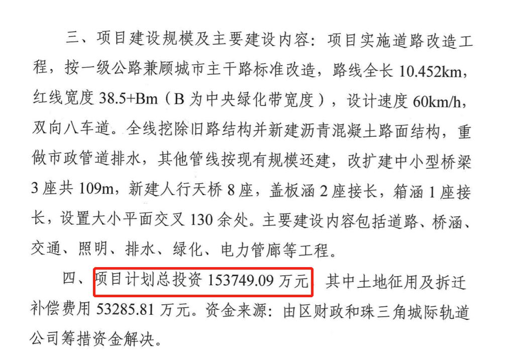 按照该工程根据此前的招标内容所示,该项目实施道路改造工程总投资共153749.09万元。