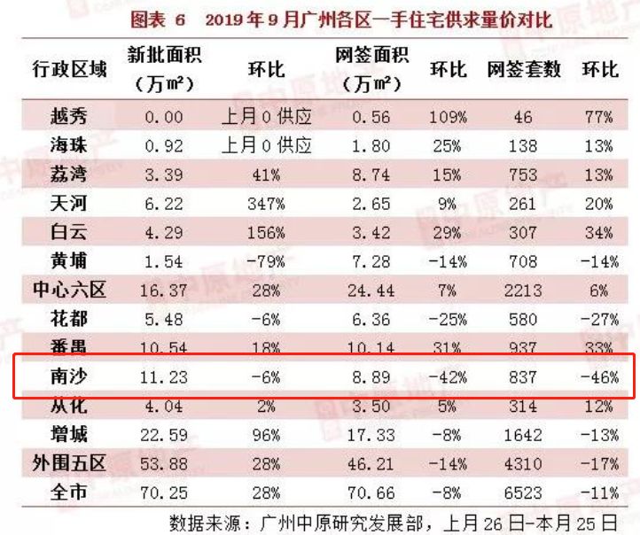 以9月南沙区楼市新货供应为例,据广州中原地产研究发展部统计,9月南沙区一手住宅新批面积为11.23万平方米,在广州11区中排名靠前,仅次于增城区。