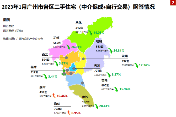 尽管今年1月份为春节月,但从广州市房地产中介协会公布的数据看,当月(统计周期为2022年12月26日至2023年1月25日)广州全市共网签二手住宅5562宗和55.10万平方米,环比分别下降7.68%和13.50%,同比分别下降20.70%和18.80%。