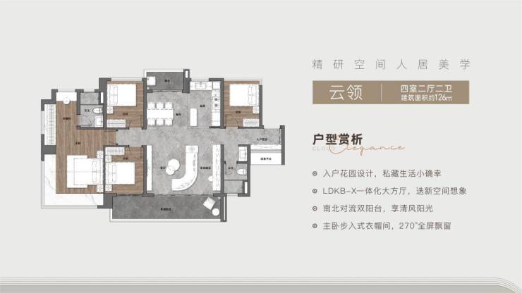 建面约126㎡四房两卫型,开门即可沉浸式享受约10.3m进深的客餐厅,奢阔尺度将超大客厅、餐厅、阳台三个独立功能间整合为一个空间,实现LDKB一体化的阔绰空间布局。
