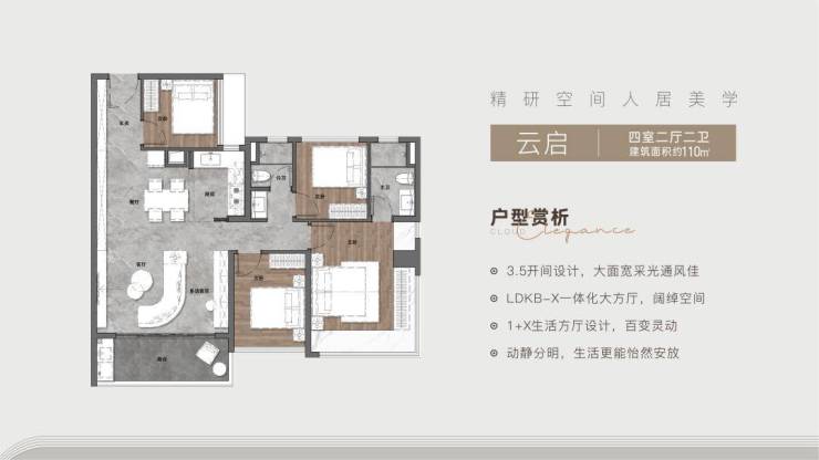 建面约110㎡四房两卫户型,玄关与客卧共用,至高空间利用率;客厅开间约5.2米阔绰尺度,令阳光时时伴随生活;可分可合中西双厨设计,将客餐厨以及景观阳台串联布局,以生活动线连通,将所有的生活意趣囊括其中。