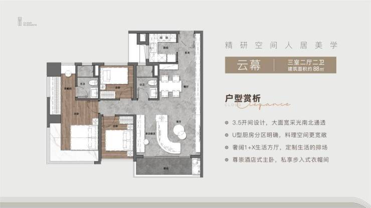 建面约88㎡三房两卫户型,奢阔1+X生活方厅开间约5米,将餐厅、客厅与阳台相连通,黄金动线布局,居家生活一气呵成;可开放式U型厨房旨在打造一个功能齐全、美观大方的空间,在日常生活中感受烹调的品质与品味。