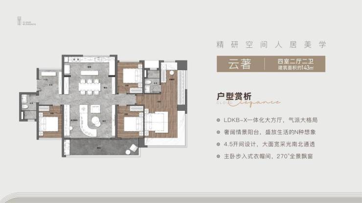 建面约143㎡四房两卫户型,玄关配置入户花园,更多生活收纳空间,可分可合中西双厨设计联通约8.4米景观长阳台,可以改造成一个 LDKB-X的一体化大方厅,容纳更多场景。
