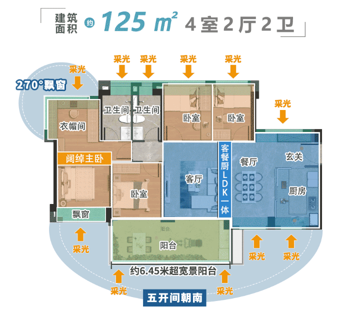 南北对流、横厅设计、客厅连通约6.5米面宽的南向大阳台,舒适度拉满。主卧套房双飘窗,通风采光一流。