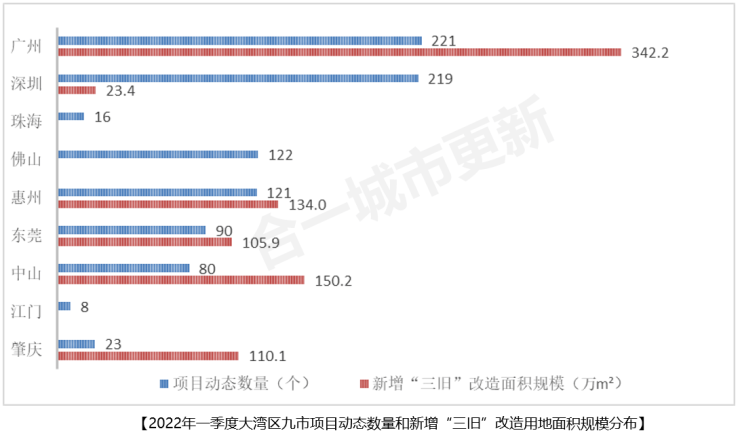 据2022年排名前列季度《广东省三旧改造行业季报》统计,本季度大湾区内地九城共监测到900个“三旧”改造(城市更新)项目动态,数量环比下降7.6%,同比下降21.8% 。其中317个为新增进入初期阶段的地块/项目,新增项目动态数量环比上升19.6%,同比下降42%,新增用地面积规模865.8万m²,用地面积规模环比下降18.8%,同比下降29.9% 。