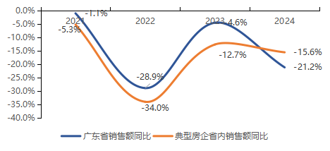 2024年,典型房企在粤总销售额约8698亿元,同比下降15.6%,降幅同比扩大2.9个百分点,但小于全省房地产销售额降幅。