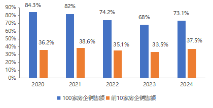 2024年,典型房企成交额占全省比重为73.1%,同比回升5.1个百分点。头部企业成交面积更为集中,销售额前十位房企占比为37.5%,同比上升4个百分点,头部聚集效应继续增强。