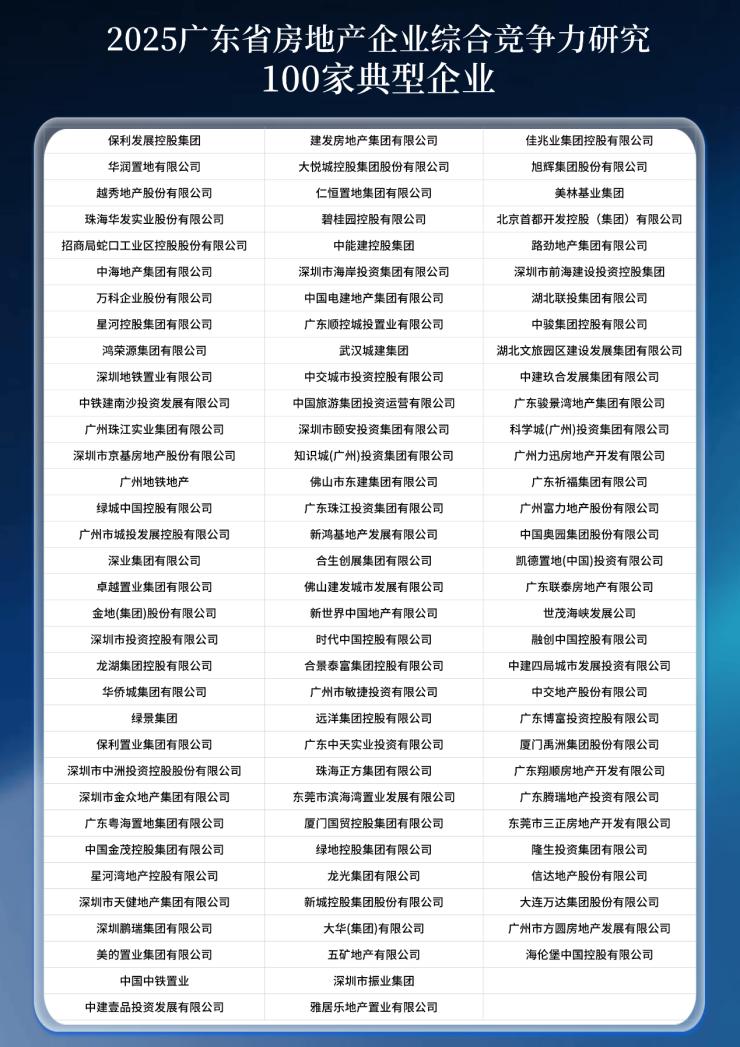 2025年6月30日,广东省房地产企业综合竞争力研究课题组于线上发布《2025广东省房地产企业综合竞争力研究报告》。