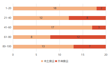 从100家典型房地产企业(以下简称“典型房企”)总部的属地分布观察,外来房企32家,较上年增加3家。头部企业中仍以本土房企为主,前20房企中仅有2家为外来房企。