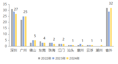 本土房企总部主要位于广州及深圳,共计52家。其中,深圳最多,共计27家,较上年减少1家;广州25家,与上年持平。其余城市中,佛山5家,东莞4家,珠海、江门各2家,惠州、汕头、潮州、云浮各1家。