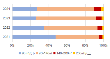 从典型企业重点项目各面积段产品的销售套数占比来看,2024年,90平方米以下刚需户型成交占比为26.8%,较2023年小幅上升1个百分点,实现止跌回稳;90-140平方米户型为成交主力面积段,占比为62.9%,较2023年下降2.9个百分点;140-200平方米户型成交占比7.5%,较2023年上升1.3个百分点;200平方米以上户型成交占比为2.8%,较2023年上升0.6个百分点。