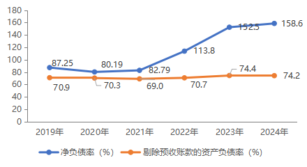 房地产市场延续低迷,企业回款减缓,部分企业负债端情况不容乐观。2024年,典型房企中的上市企业净负债率均值为158.6%,同比继续上升。剔除预收账款的资产负债率均值74.2%,同比下降0.2个百分点,但仍处于相对高位。