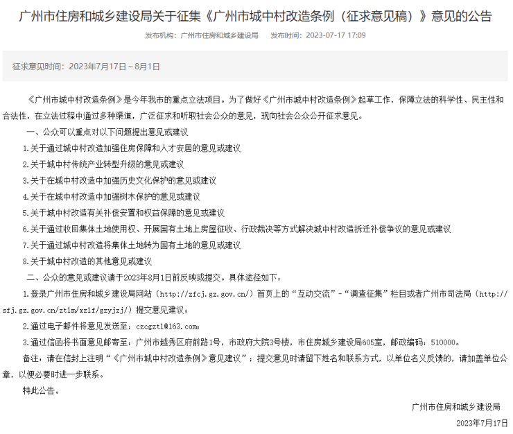 广州市住房和城乡建设局发布关于征集《广州市城中村改造条例(征求意见稿)》意见的公告,本次公告仅对条例中的部分条款公开征询意见,全部条例或将在后续向公众公布。