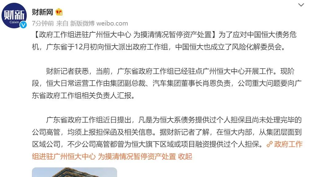 《财新》援引恒大内部知情人士报道称,12月12日,广东省政府工作组口头通知恒大各个区域公司,要求暂停恒大旗下所有资产处置事项。“如果确实是比较着急的资产处置工作,区域公司可以按照一事一议原则上报。”恒大内部人士告诉财新记者,此举应是工作组正式进场摸底,想要厘清资产负债真实情况。报道指出,现阶段,恒大日常运营工作由集团副总裁/汽车集团董事长肖恩负责,公司重大问题要向广东省工作组相关负责人汇报。广东省工作组近日指出,凡是为恒大系债务提供过个人担保且尚未处理完毕的公司高管,均须上报担保函及相关信息。在恒大内部,从集团层面到区域公司,不少高管都曾为恒大旗下区域或项目公司融资提供过个人担保。