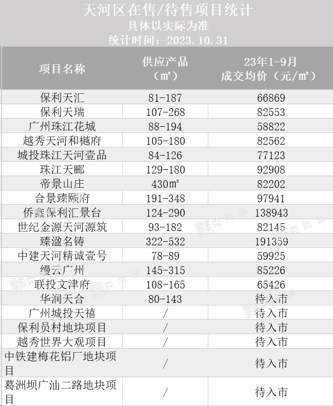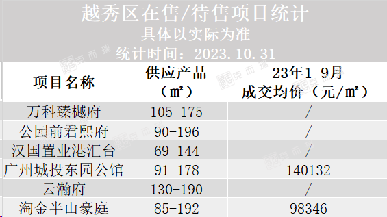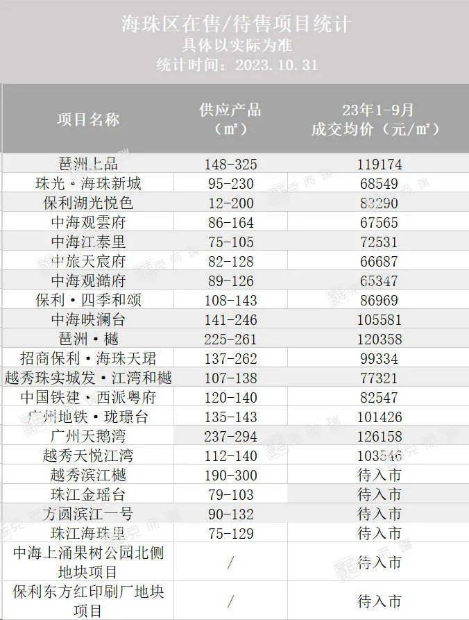 截至10月底,海珠区累计23个新盘,16个项目在售,7个项目待入市,其中海珠区11月预计将有2个项目入市,分别是珠江海珠里与珠江金瑶台。