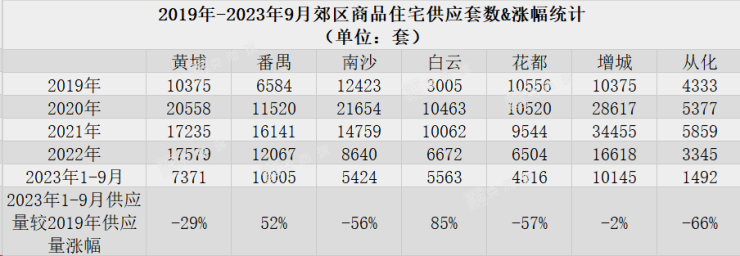 克而瑞数据监测显示,近五年来供应套数降幅最高的区域是从化,降幅为66%,而番禺以52%的供应涨幅为郊区最高,同时也是截至今年9月底郊区唯二供应量仍保持在万套的区域。
