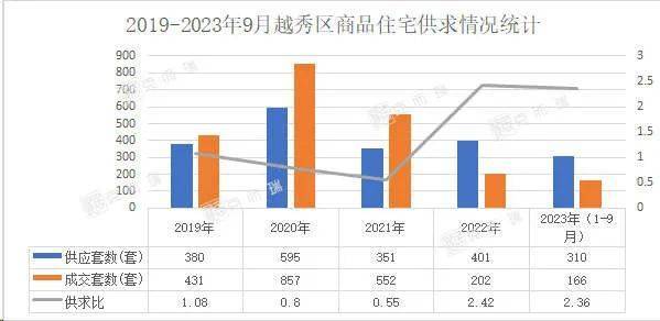 今年是越秀区近年来极为罕见的供应大年,克而瑞数据监测显示, 越秀区的供求比由2021年的0.55一度跃入今年的2.36,从供求比走势图来看,目前越秀已是严重的“供大于求”。