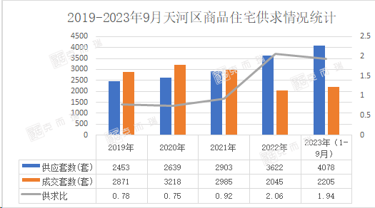 从供求比来看,克而瑞数据监测显示,2019-2021年天河的供求比低于1.0,处于“供不应求”的态势,而到了近两年供求比大于1.0,供求关系转为了“供大于求”。