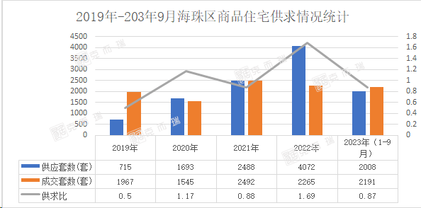 尽管海珠区新盘数量多,但从供求关系上来看,数据显示,近五年来海珠区供求比小于1.0的年份有三年,分别是2019年、2021年、2023年1-9月,而供求比大于1.0的只有两年,分别是2020年、2022年,由此可知,海珠整体处于“供不应求”的态势。
