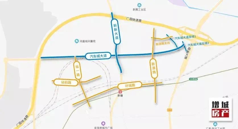 新塘站新塘站是广州地铁13号线增城段较大的一个站点,其距离大润发购物中心、凯达尔枢纽广场都很近,商业配套较为成熟。同时,未来这里还将打造成广州东部交通枢纽中心新塘TOD,汇聚5条城市地铁、2条城际轨道、2条国家高铁等九大轨道黄金交通资源。